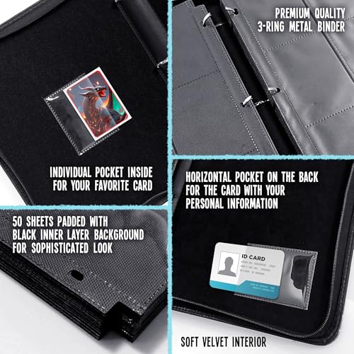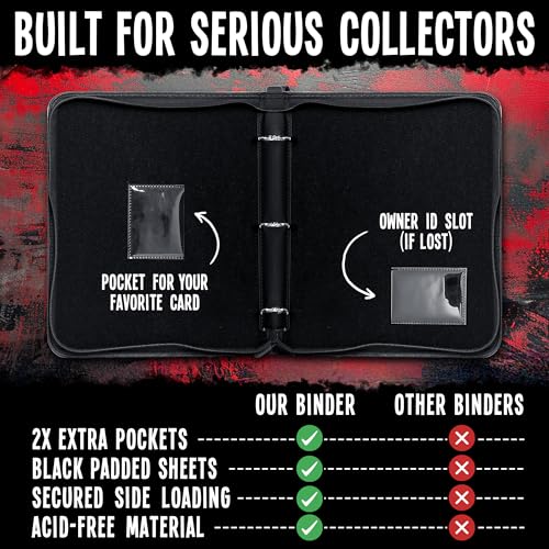 [TAKE YOUR COLLECTION TO THE NEXT LEVEL] – Showcase your cards like never before. This card collector binder features sleek black-backed sleeves that make your cards truly pop while delivering maximum protection. Includes a front pocket to display your favorite card and a back pocket for personal information – combining premium style and real functionality for serious collectors.