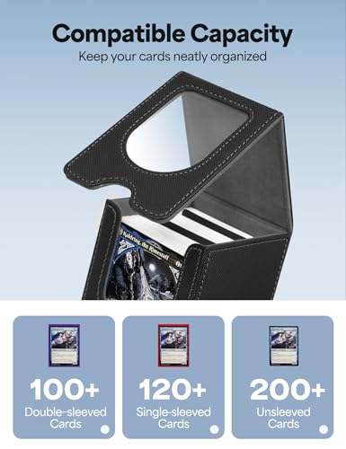 Storage Capacity: Built-in 2.8×3.1×4 inches trading card storage box compartment neatly and compactly holds: 100+ double-sleeved cards, 120+ single-sleeved cards, 220+ unsleeved cards, easily handling your game nights