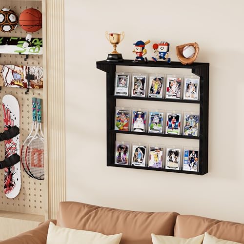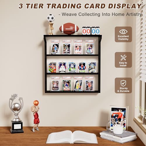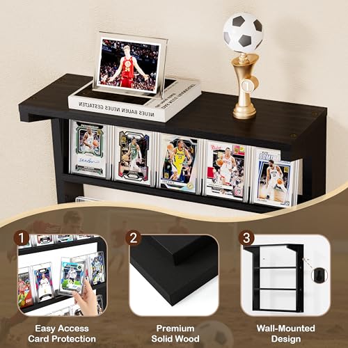 Emfogo Trading Card Display Stand for Wall, 3 Tier Wooden Graded Card Display Stand, Sports Card Display Case, Trading Card Stands for Display Collection, Black