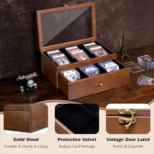 Emfogo Trading Card Storage Box, 70+ Graded Card Storage Box with Custom Drawer, Wood Storage Display Case with Large Clear Window, Sports Trading Card Box with Dividers for TCG/Mtg Collection