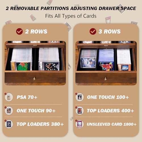LARGE CAPACITY SPORTS CARDS STORAGE BOX: Spacious drawer of trading card display case with two wood partitions allow for custom two or three row layouts, which meets the collection needs of different card types. The two rows is specially designed for graded cards storage display, hold more than 70 graded cards. Most of cards can be storaged in three rows layout, hold up 400+ top loaders or 100+ one touchs or 1800+ sleeveless cards.