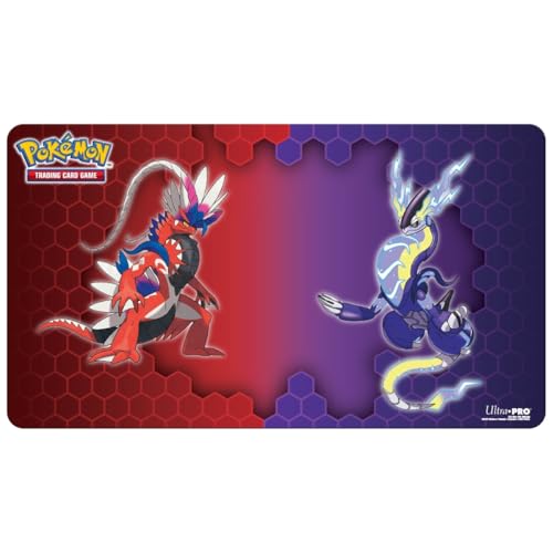 Playmats for PKM feature vibrant, full-color artwork of Koraidon & Miraidon. Made with a soft fabric top to reduce damage to cards during play and a non-slip rubber backing to keep the playmat from shifting during use, playmats enhance the gameplay experience. With dimensions of approximately 24 in. x 13.5 in., a playmat also makes an excellent oversize mousepad for home or office.