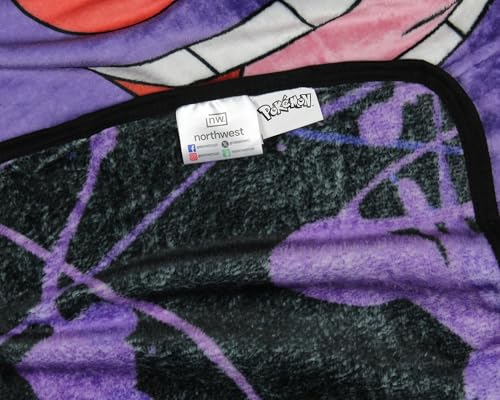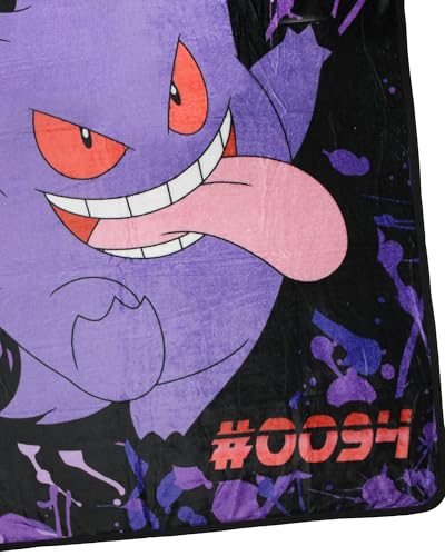 Bold In-Fabric Design – This throw blanket features a Pokemon Trading Card-inspired graphic set on a black background with purple splatters. Gengar is centered on the plush fleece throw with Gengar’s Pokedex number listed on the bottom left of the throw blanket. At the top of the blanket, Gengar’s name is listed in an eerie red font