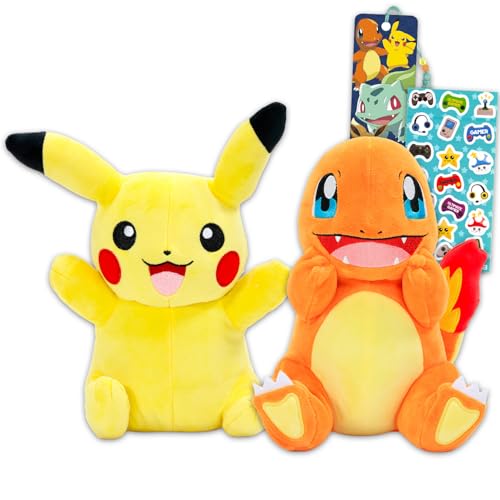 Pokemon Plushie 2 Pack – Bundle with 2 Plush 8″ Figures Featuring Pikachu and Charmander Plus Bookmark, Stickers | Pokemon Stuffed Animals Set. This Pokemon plushie bundle includes two 8” stuffed Pokemon characters: one Pikachu plushie figure and one Charmander plushie figure. Pokemon plushies are perfect for snuggling with your little one or creating their own adventures! Perfect for Pikachu and Charmander fans, boys and girls alike. These Pokemon plush toys are durable and feature detailed embroidery work, making them the perfect cuddle toy for your little adventurers. This officially licensed Pokemon plush toy set also includes a Pokemon bookmark and video game stickers.