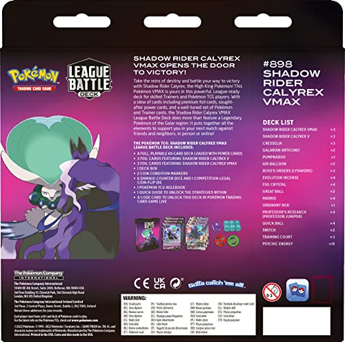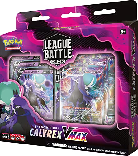 The Pokémon TCG: Shadow Rider Calyrex VMAX League Battle Deck includes 1 full, playable 60-card deck loaded with power cards, 3 foil cards featuring Shadow Rider Calyrex V, 3 foil cards featuring Shadow Rider Calyrex VMAX.